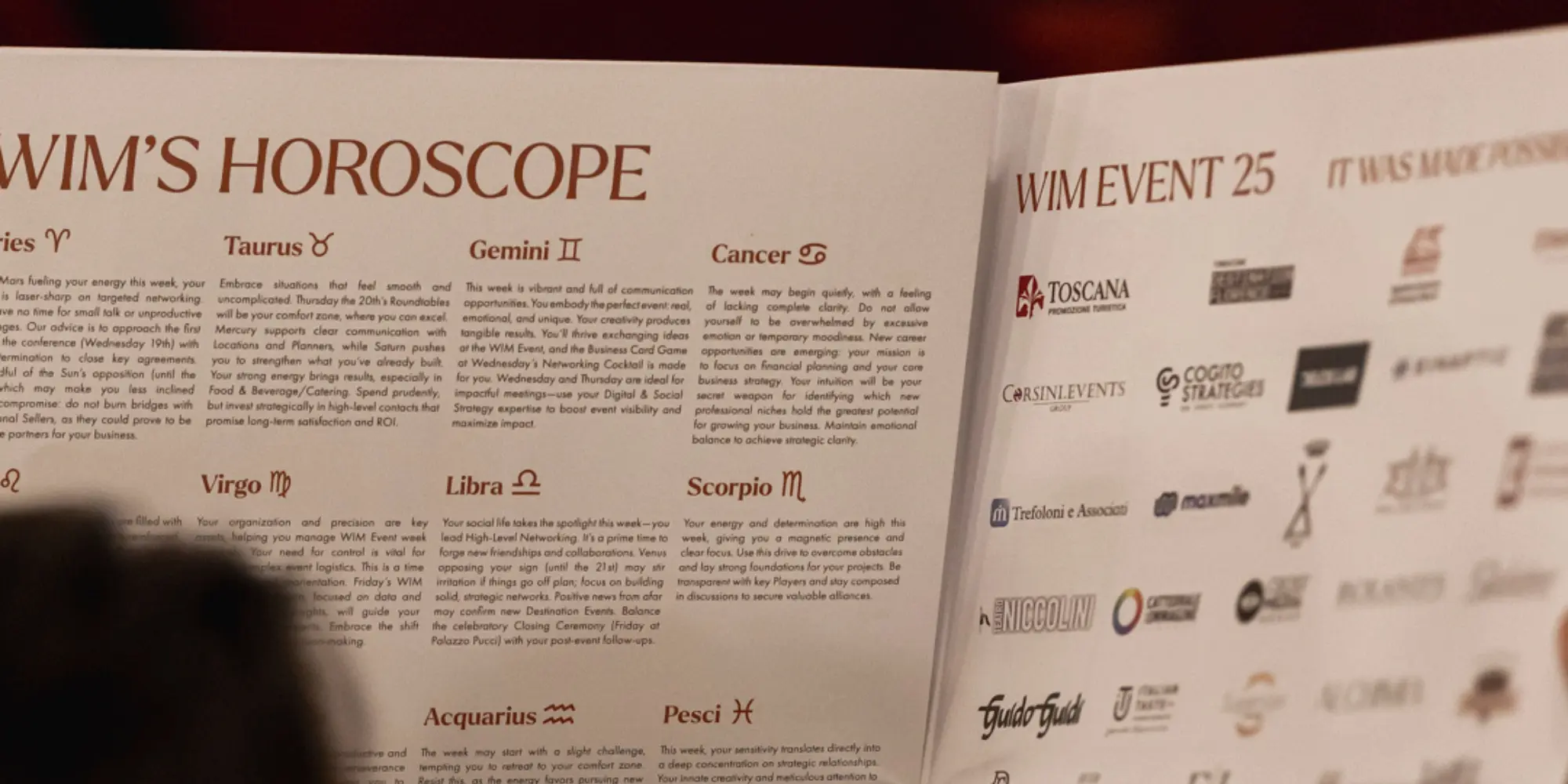 The creative process focused on translating WIM’s identity into a clear and elegant visual language, combining graphic consistency with attention to materials and print finishes. Particular care was given to the invitation box, designed to create a refined first impression through the use of soft-touch paper and bronze embossed details, while the visual system was extended across editorial and spatial elements to ensure a coherent and recognizable experience during the entire event.